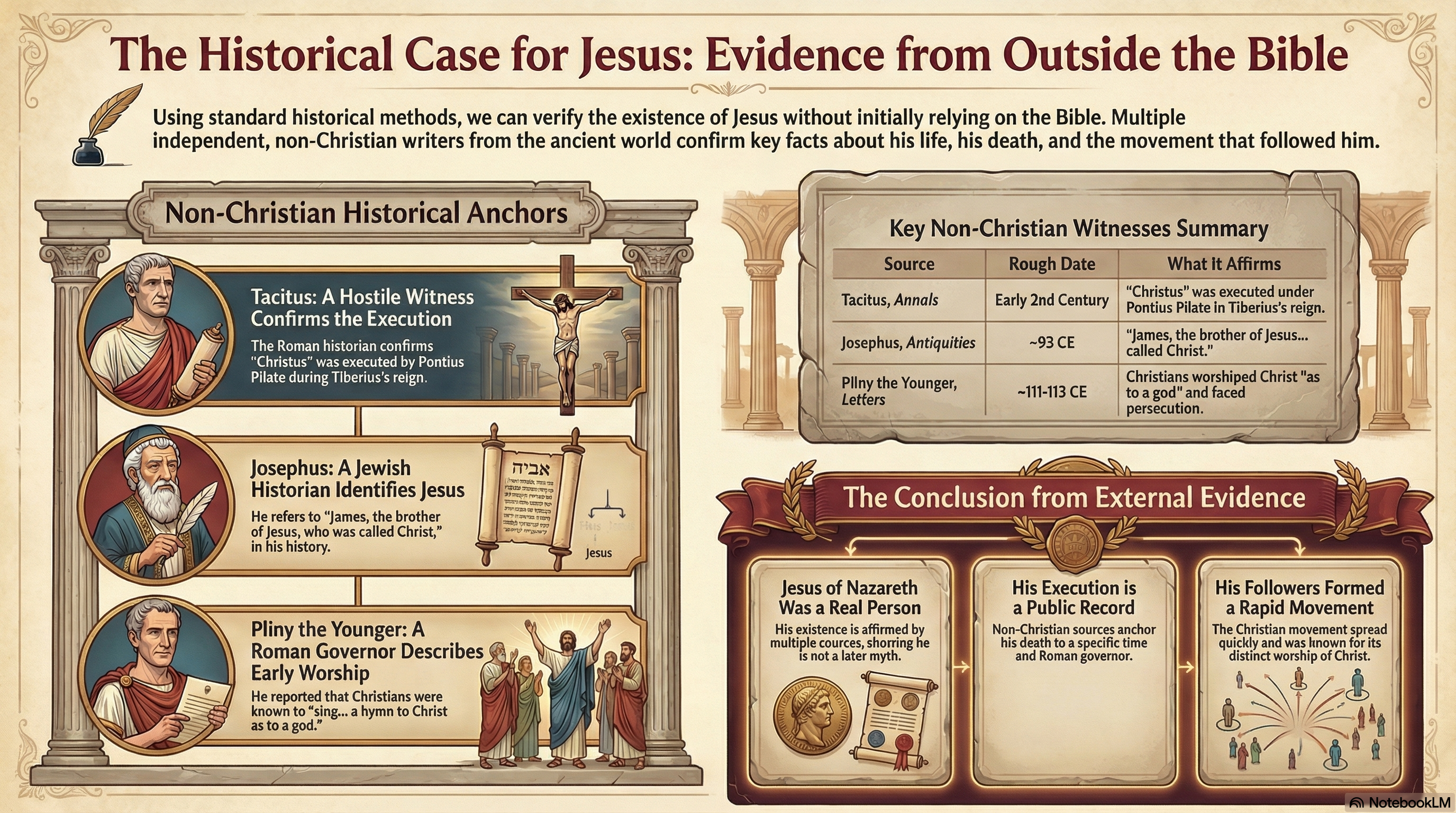 A two-layer, Reformed introduction to the question “Did Jesus really exist?”—using standard historical method and key non-Christian sources, while keeping Scripture (KJV) as the church’s final authority.