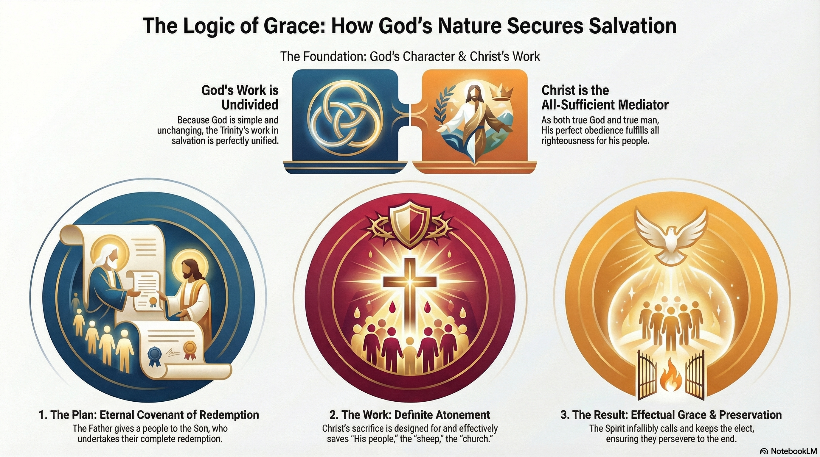 Covenant Theology does not overlay Scripture with a foreign scheme; it exposes the frame Scripture itself declares. Thus theology proper (who God is) and Christology (who the Mediator is) cohere with salvation by grace alone. Because the one God is simple and the Trinity works indivisibly ad extra, the decree of the Father, the redemption accomplished by the Son, and the application by the Spirit intend and secure the same people. Scripture joins these without remainder: those foreknown and predestinated are effectually called, justified, and glorified (Romans 8:29–30); the Son has authority to give eternal life “to as many as thou hast given him” (John 17:2, 9); and the Spirit sanctifies those chosen “to salvation through sanctification of the Spirit and belief of the truth,” by the gospel call (2 Thessalonians 2:13–14). Therefore New-Covenant promises are effectual realities, not bare offers, for God writes His law on the heart, ensures saving knowledge of Himself, and remembers sin no more (Hebrews 8:10–12; Jeremiah 31:33–34). This summary accords with the Westminster Confession of Faith, especially chapters II–III and VIII.