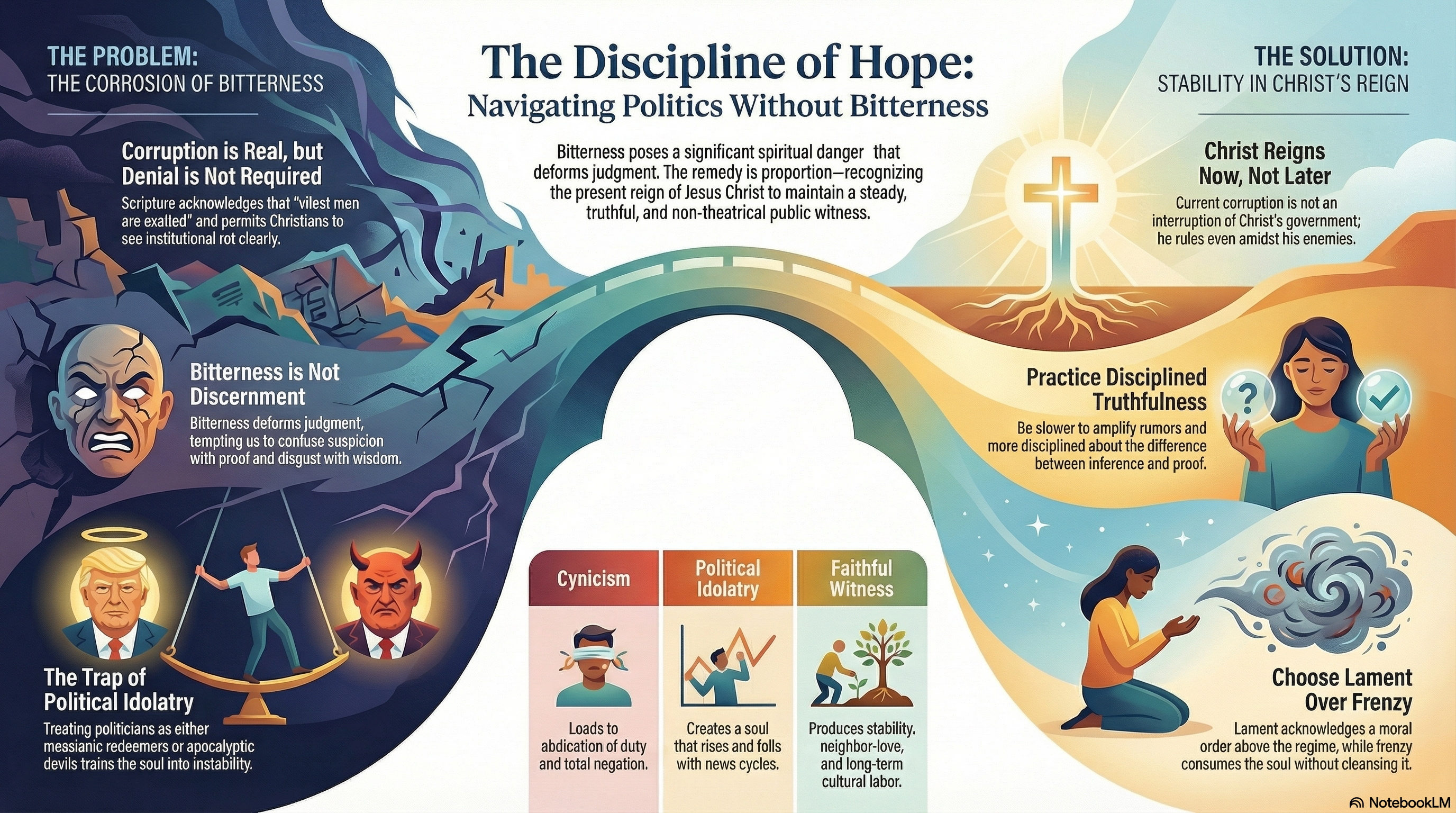 Political corruption is real. Public lies are real. Market-moving propaganda, cynical compromise, bribery by another name, endless war rhetoric, and the idolatry of party are not imaginary problems. A Christian does not have to deny any of that in order to be spiritually healthy. But bitterness is still a spiritual danger, even when the grievance is justified. The Christian answer to political disgust is not naivete, not partisan fanaticism, and not despair. It is the steady confession that Christ reigns now, that princes are not saviors, and that truth-telling, sober judgment, neighbor-love, and patient public faithfulness remain our duty in a crooked age.