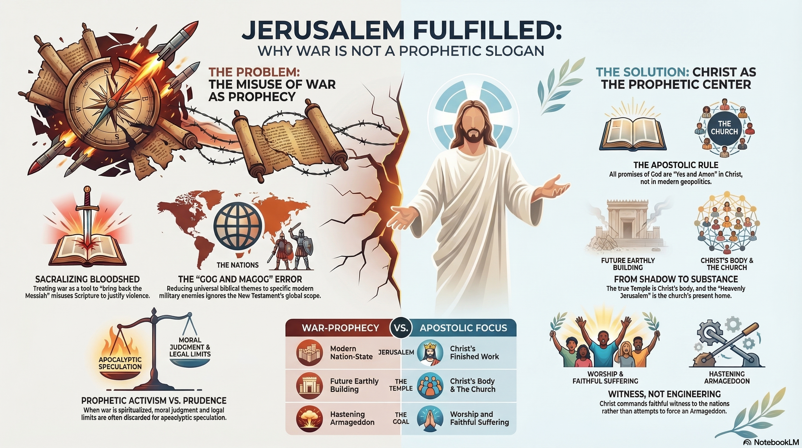 Jerusalem finds its decisive prophetic fulfillment in Christ and His completed work, not in modern war rhetoric. Any theology that turns present conflict into a sacred mechanism for "bringing back the Messiah" has abandoned the apostolic rule of interpretation and obscured the glory of the gospel itself.
