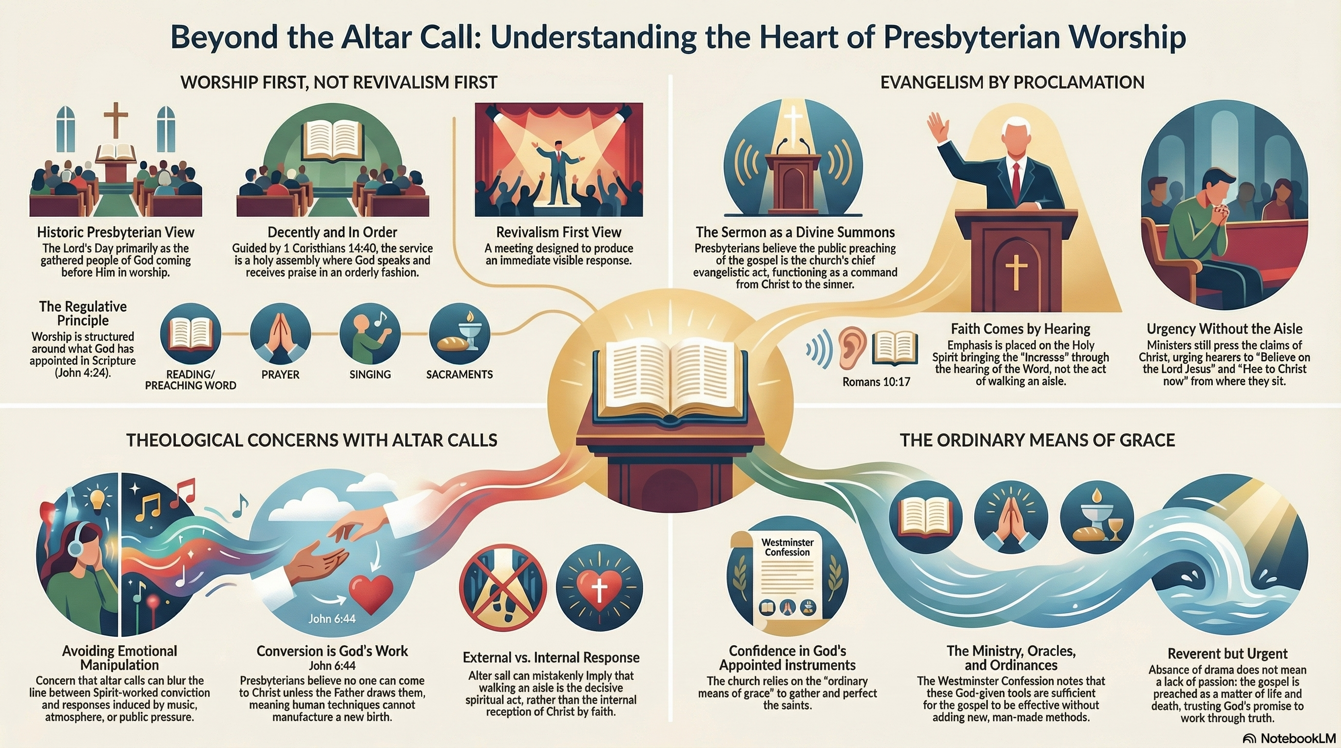 Claim. Presbyterian worship does not ordinarily center on altar calls, not because it is indifferent to evangelism, but because it believes the Lord's Day gathering is a covenantal meeting with God, ordered by Scripture, and centered on the ordinary means of grace Christ has appointed for the gathering and perfecting of His people.